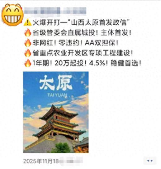 近日,投资东谈主刘巍(假名)向海报新闻记者响应,近期有销售东谈主员时常通过微信一又友圈、群聊等渠谈,推介山西一国企为主体的融钞票品,以“年化收益4.5%、国企布景、政府背书”为中枢卖点眩惑投资者。但刘巍深切了解后发现,该居品臆测打算偏离传统钞票拍卖逻辑,资金无第三方托管,且本旨保本付息,由此怀疑其是否范例。