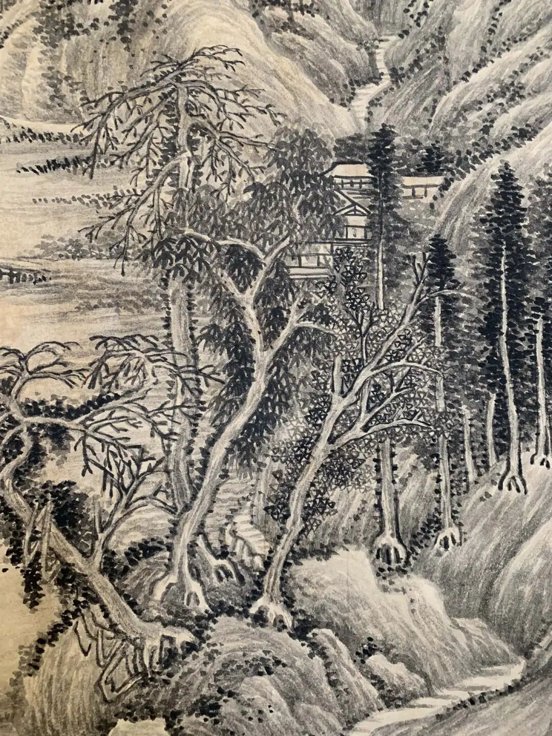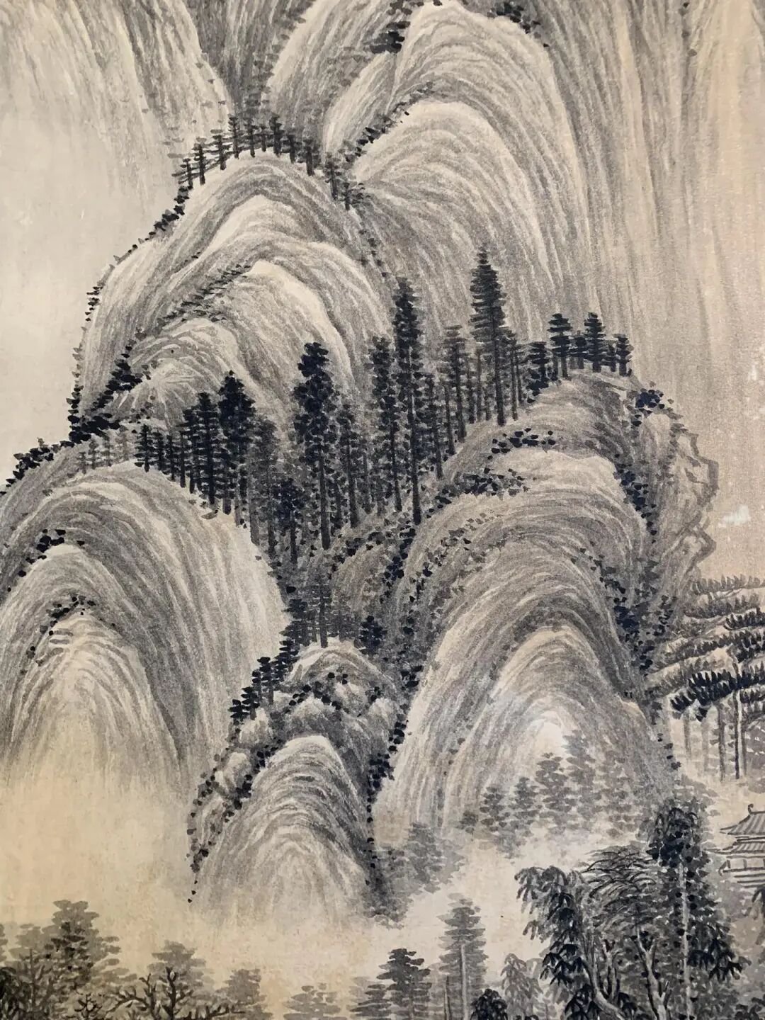 构图更绝!黄公望画《富春山居图》,山是松懈的“海潮线”,张大千却把主峰画得陡峻,像刀削的陡壁,但用潸潸一绕,立马软下来,刚柔并济。山眼下几间茅庐,屋中用浓墨压着,房檐却用淡墨勾,虚实一双比,屋子像要飘起来,比黄公望的“实打实”多了份仙气。