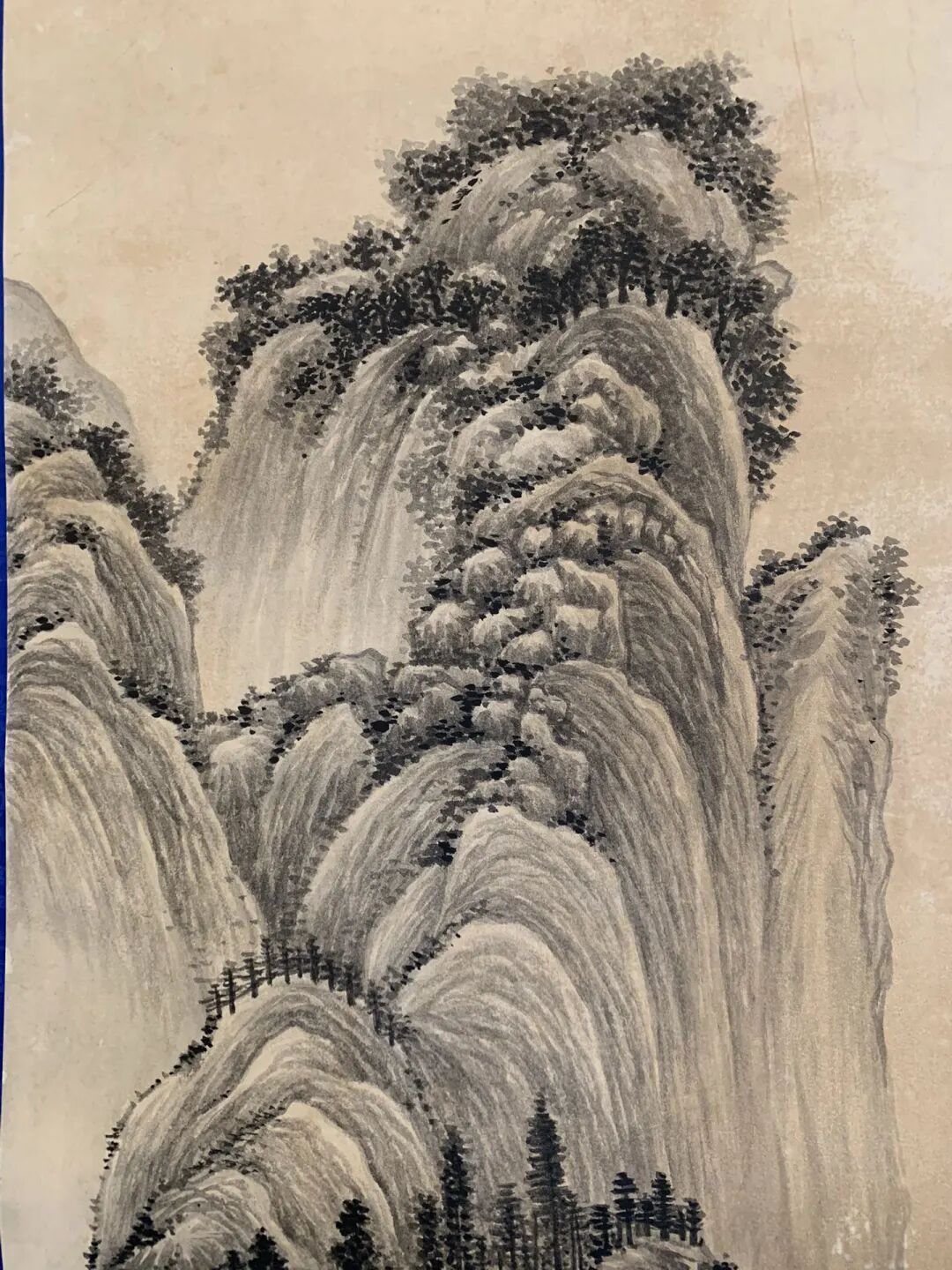 张大千这轴“仿大痴说念东说念主法”的山水画,乍一看是老师临古,细品全是“提神计”!大痴说念东说念主即是元代黄公望,他画山水爱用“披麻皴”,线条像麻绳相同紧密,专治多样山石纹理。张大千这画里,山体抽象用浓墨勾得硬气,皴法却学黄公望的“披麻”,但没照搬——他掺了董源的“雨点皴”,密密匝匝的短笔,像山体被雨水砸出的坑,远眺是黄公望的温润,近看又多了份放心,活脱脱“古法新穿”!