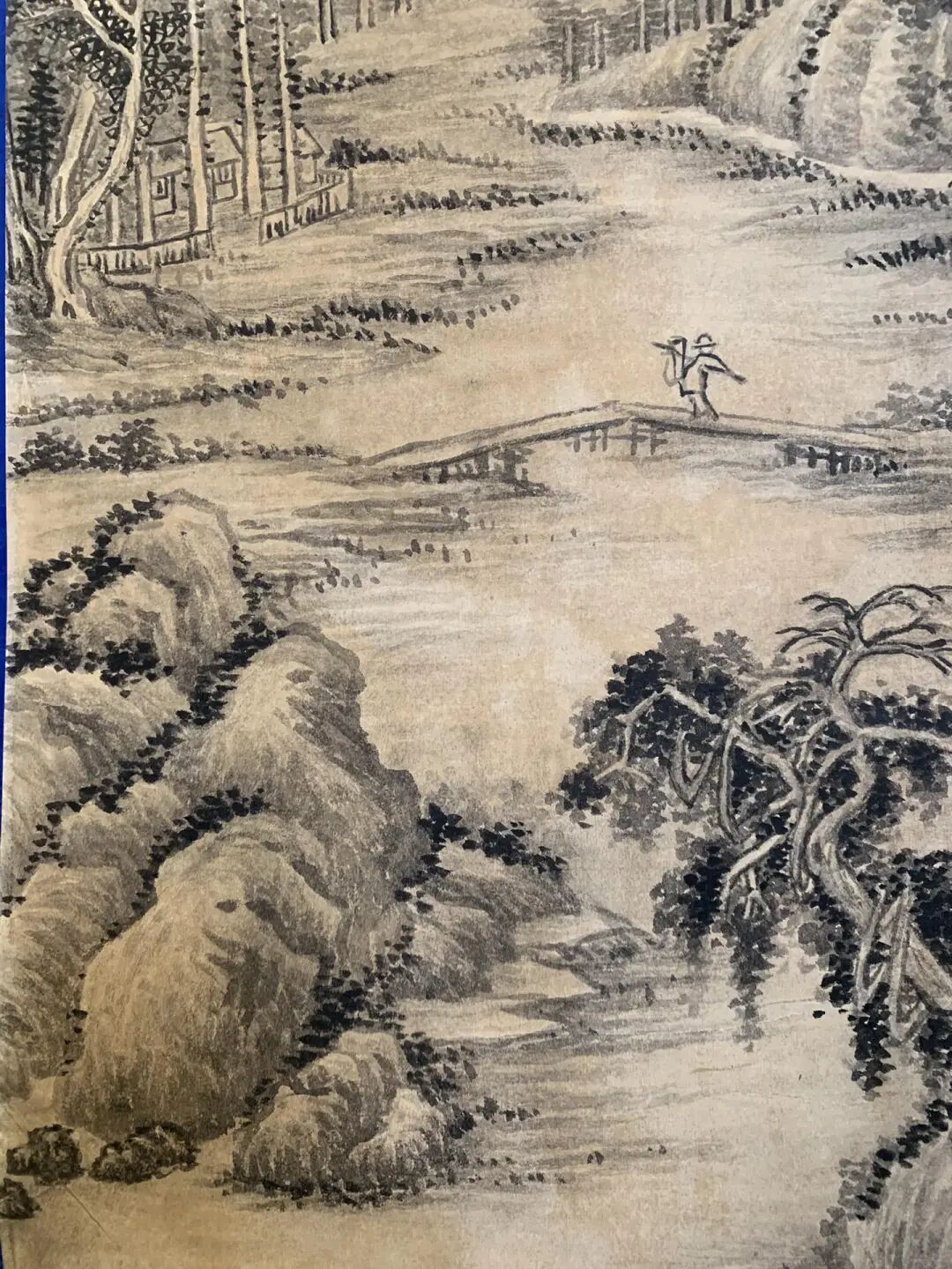 再说情势,黄公望爱用浅绛,淡赭石配花青,高雅得像水墨里泡过茶。张大千偏不!他在山头点了几笔朱砂,像秋天的枫叶刚冒头,冷不防撞进寒冷的画面,暖得俏皮;溪水用淡蓝晕染,反照着山影,比黄公望的“白水”多了份灵动,仿佛能听见水流声。